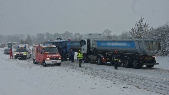 Ein Muldenkipper, der Richtung Schärding unterwegs war, kam aufgrund der Schneefahrbahn ins Schleudern. Ein nachfolgender Muldenkipper konnte nicht mehr rechtzeitig bremsen und schob den ersten LKW auf die Gegenfahrbahn. Eine PKW-Lenkerin auf der Gegenfahrbahn konnte nicht mehr rechtzeitig ausweichen und kollidierte mit dem LKW.