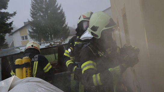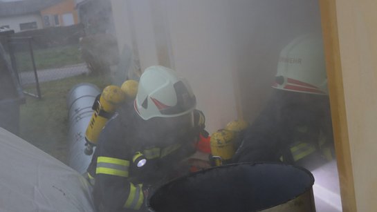 Die zweite Station der Übung fand in einem leerstehenden Gebäude am Firmengelände statt, bei welcher von den Kameraden nochmals Ihr gesamtes Können gefordert wurde. In zur Gänze vernebelten Gebäude musste durch die einzelnen Trupps eine vermisste Person gerettet, sowie ein Brandherd ausfindig gemacht werden. Ein wesentliches Augenmerk wurde hier auf die Arbeit unter Nullsicht gelegt, wobei hier diverse Suchtechniken zum Einsatz kamen, aber auch die Vorgehensweise im Innenangriff erprobt werden konnte.