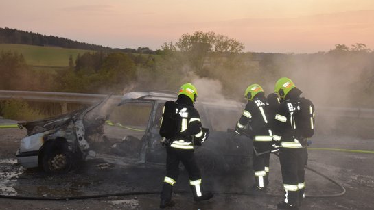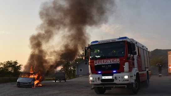 Mit einer realitätsnahen Einsatzübung zum Thema "Pkw-Brand im Freien" startete die FF St. Florian am Inn am Dienstag in das zweite Übungshalbjahr. Schauplatz war das Betriebsgelände der Firma Schärdinger Granit in Allerding, wo ein brennendes Fahrzeug auf einer stark befahrenen Straße simuliert wurde.