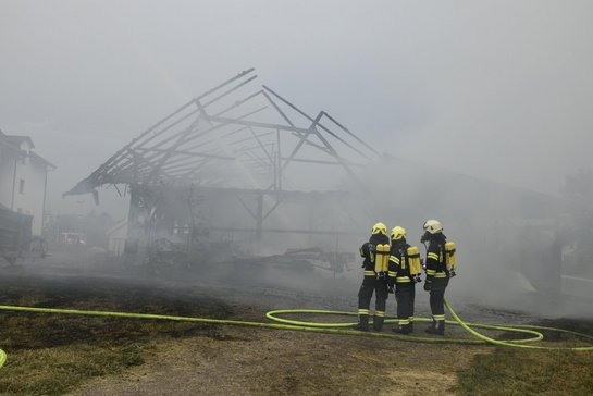 Am Einsatzort eingetroffen mussten die angerückten Kräfte feststellen, dass die landwirtschaftliche Halle, trotz der rasch gesetzten Erstmaßnahmen, bereits in Vollbrand stand. Neben der umfassenden Brandbekämpfung der Halle wurde durch den Einsatzleiter sofort auch der Schutz der in nur wenigen Metern angrenzenden Gebäude ins Auge gefasst. Das sofortige Einschreiten der Feuerwehr machte sich bezahlt, da eine Brandausbreitung auf die angrenzenden Mehrparteienhäuser sowie auf den angrenzenden Supermarkt verhindert werden konnte. Die insgesamt 9 alarmierten Feuerwehren trafen in kurzem zeitlichem Abstand am Einsatzort ein, wodurch die umfassenden Löschmaßnahmen kontinuierlich ausgeweitet werden konnten. Die immense Rauchentwicklung erschwerte die Löschmaßnahmen erheblich, im Nahbereich konnte der Löscheinsatz nur unter der zu Hilfenahme von Umluft unabhängigen Atemschutzgeräten erfolgen.